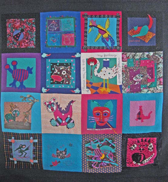 | My friend Sandra and I started a quilting group in the late eighties, and the quilt below represents one of the quilts we made as a group. This quilt is the one I recieved and each person made an animal square. I just quilted it a earlier this year with my wonderful longarm. Now it is a very comforting cover for my bed. |