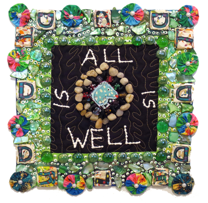 Each quilt in the “Abundance Quilt” series is 12”x12” and is an expression of the abundance that we all share. Each one has a phrase that can be used as a tool or a reminder to become more aware of something to be thankful for and to appreciate about our lives. All of the artworks are machine quilted and embellished with buttons, beads and paint to celebrate the joy and richness that we will find within ourselves if we can only look for it. These quilts are sure to enhance the walls of your home or office and make a difference in how you feel.