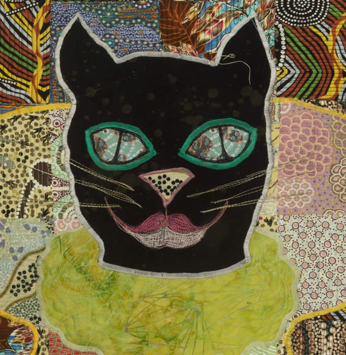 2015, 43”x34” , fabric, thread, machine pieced, machine quilted I love the Aboriginal fabrics and cats and Klimt paintings, so I combined the three into a quilt of my own style, but, I made sure to create a pattern for any student who wanted to do the same thing, but, perhaps needed a jumping off point to make it happen. Much of this thinking is in response of my need to let go of the isolation of an artist creating unique work and the desire to come to terms with my willingness to share, belong and participate.