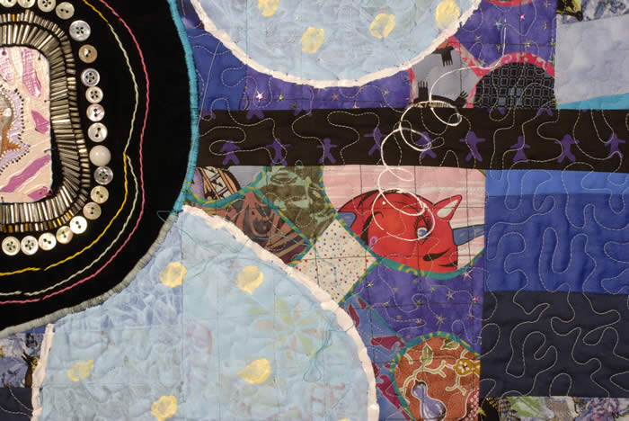 Fabric, acrylic paint, thread, machine appliqué, machine quilted, buttons, beads, embroidery
