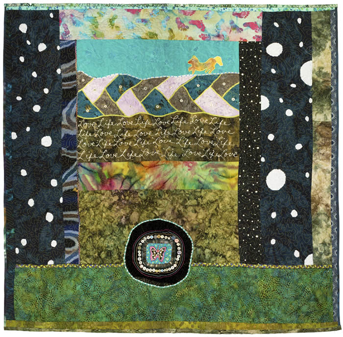 Fabric, acrylic paint, thread, machine appliqué, machine quilted, buttons, beads, embroidery