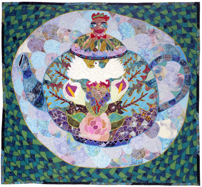 There is something about a teapot that has a meaning of containment; there is a circle; a sense of closure; this is wholeness; this is the mandala, and yet this container has a handle; you can pick it up and hold it; and there is a spout, an opening; you can pour out whatever is contained. The mandala imagery gives it a Spiritual, even sexual quality and the handle and the spout bring it down to earth; you can use it! And yet this is an image on fabric, a sewing, layering of cloth, a quilt, not to be used as a bedcover, but to be hung on the wall.