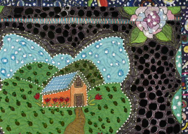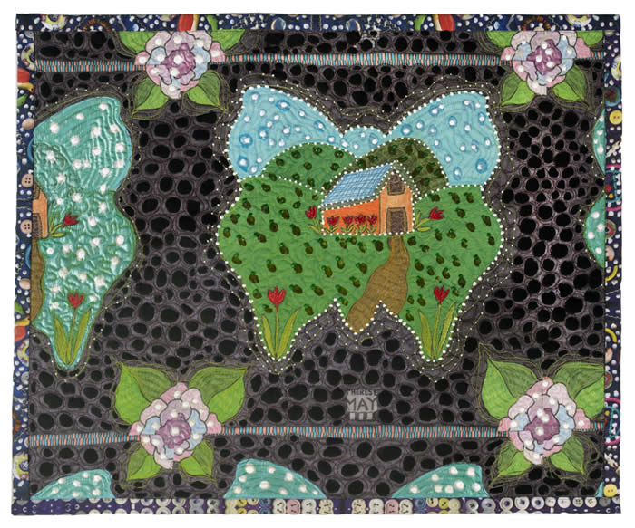 20"x24" Drawing printed onto fabric, thread, acrylic paint, machine quilted Butterflies are loaded with meaning in terms of transformation and change. They start out as caterpillars and evolve into the gorgeous winged insects that we all admire so much. I love the green winter hills of California and the fact that I’ve grown into my “golden years” here.