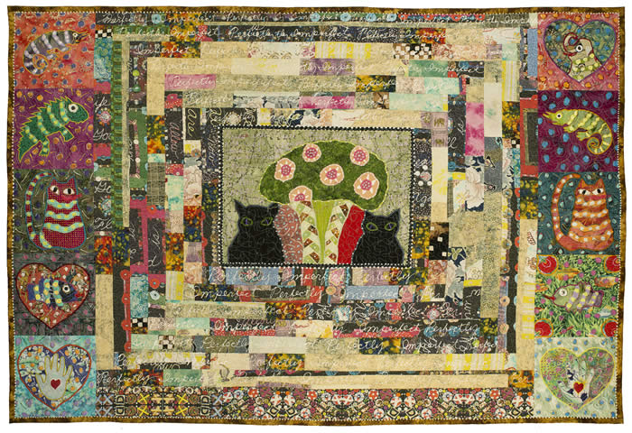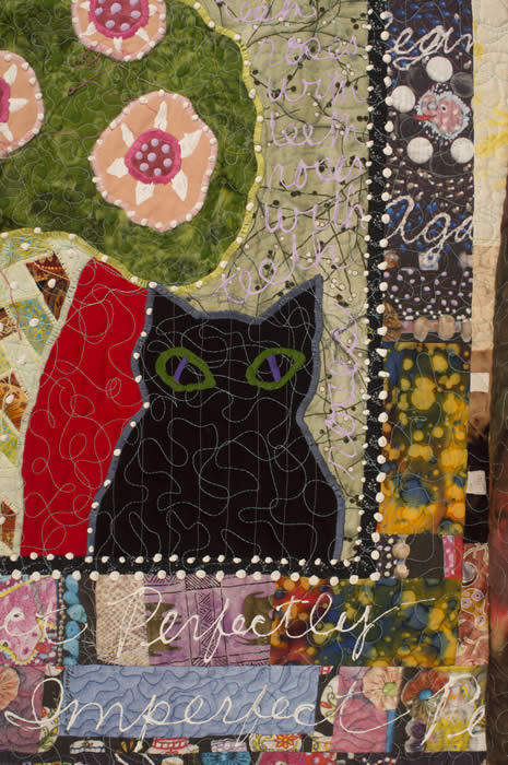Perfectly Imperfect 56"x79" fabric, thread, printed fabric with my images, acrylic paint Writing is a wonderful way to move through mental blocks and so is quilt making. A combination of the two can be very healing for the maker as well as the viewer. Writing with fabric paint on the surface of my quilt gives it an added energy and good feeling for me and for the audience. Every so often I worry about whether or not I’m good enough, because I have so many flaws or my quilt has flaws according to how I’m feeling at any given moment. Perhaps what I imagine others are thinking is really my own judgment or my own fear of the unknown. In this quilt I let go of it all and I said to myself, just go with the flow; have a great time making the thing and whatever the judges decide is ok. Either way, my quilt and I are Perfectly Imperfect!! Design Inspiration I began with a drawing of a rose bush flanked by black cats and made it into an appliqué. I love the images of early American hooked rugs, with animals and plants as subject matter, so this is often a starting point for me. I also love American quilts, one of them being the log cabin design. Previously, I had sewn together some pieces of fabric to make a house shape, a nice idea, but it wasn’t working very well, so I allowed myself to cut it all into strips and sew them around my appliqué work. Then I added some other animal patches to the sides of my “Log Cabin” to serve as “guardians”
