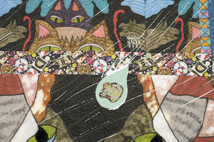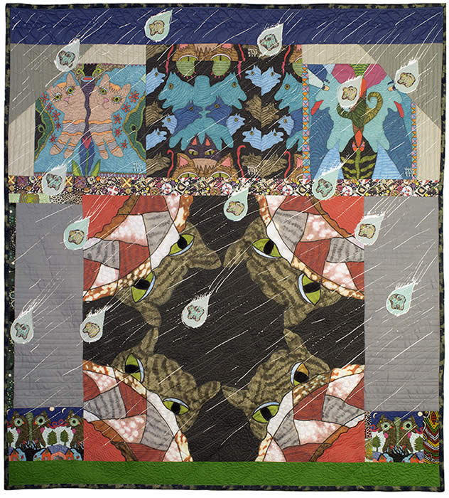 Drawing printed onto fabric, some commercial fabric, thread, beads, acrylic paint, machine pieced, machine applique, machine quilted Prayer for Raining Cats and Dogs I chose to create this quilt because I was attracted to the saying, “Raining Cats and Dogs.” In my repertory of drawings I have many images of cats and dogs, plus here in California we are currently having a drought. So, I decided to make an artwork that would affirm the idea of literally raining cats and dogs as a humorous but sincere prayer for rain here in the Golden State. In my quilt, it’ s raining cats and dogs and the pet cats and dogs are looking out the windows at the cat and dog rain drops. New York Beauty Quilt Influence (partly) the rest improvised