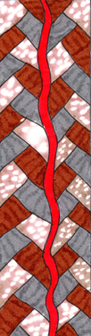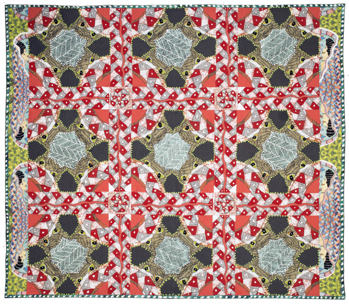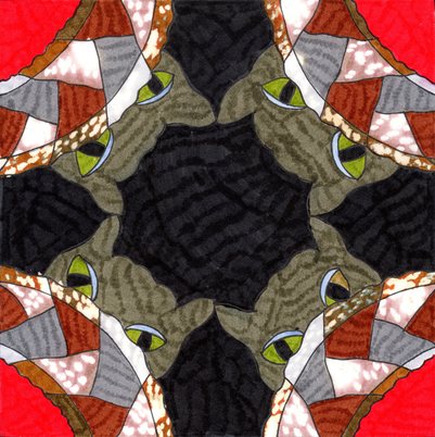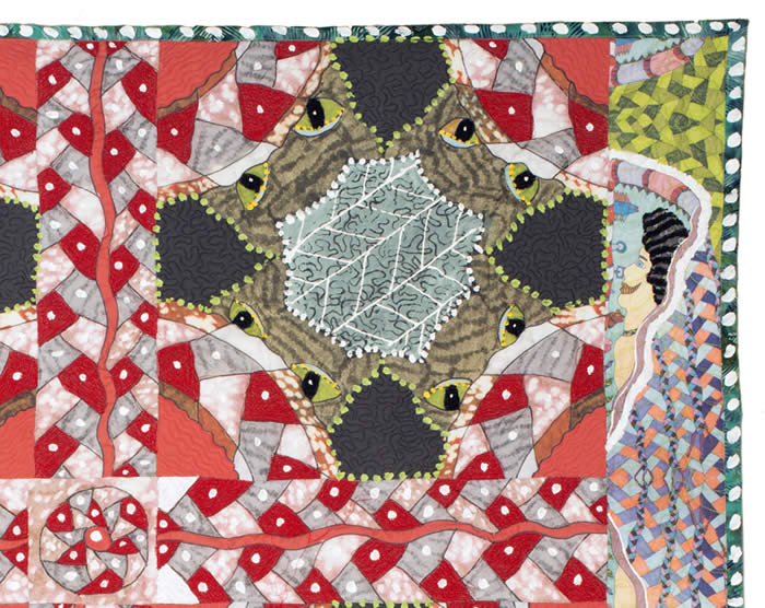 Drawing printed onto fabric, some commercial fabric, thread, beads, acrylic paint, machine pieced, machine applique, machine quilted. Each small red shape is completely covered with red thread stitching. I really like the New York Beauty quilt I saw at the San Jose Museum of Quilts & Textiles from the show of Bill Volckening 's quilt collection a while back. I made another quilt, which I'm calling "San Jose Beauty" I made a drawing of the basic block and also drawings of the sashing and small connecting blocks. The side borders are printed from another of my drawings.