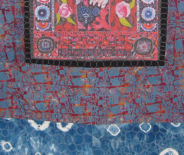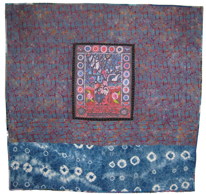I’ve been fascinated with trees for a long time; since childhood. I especially love the form and shape of trees. In the center of this quilt I’ve included a digital image printed on fabric of my 1993 work, “Pregnant Winter Tree.” For the border I used a batik that I bought from Fabmo, a non profit organization that facilitates the recycling of designer fabric. The Indigo piece across the bottom is a piece I dyed in the early 90”s. This quilt looks wonderful on the wall, and can also be used on a bed.