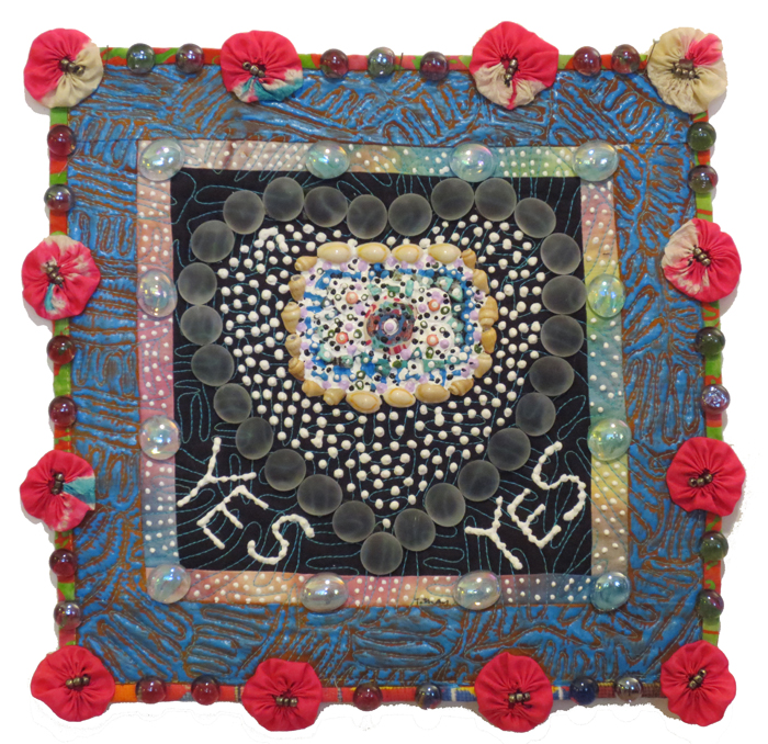 Each quilt in the “Abundance Quilt” series is 12”x12” and is an expression of the abundance that we all share. Each one has a phrase that can be used as a tool or a reminder to become more aware of something to be thankful for and to appreciate about our lives. All of the artworks are machine quilted and embellished with buttons, beads and paint to celebrate the joy and richness that we will find within ourselves if we can only look for it. These quilts are sure to enhance the walls of your home or office and make a difference in how you feel.