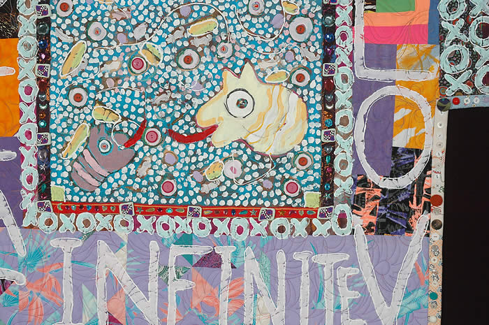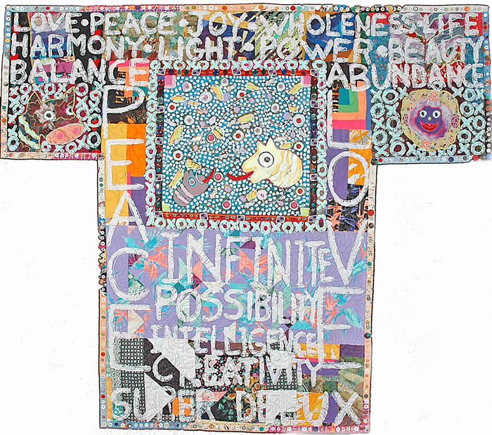 71"x61" Fabric, thread, acrylic paint, buttons, polymer clay, machine applique, machine pieced, machine quilted My goal here was to collect the “missing pieces” of a project, putting them all back together and making something good; completing and making it whole. This is what I have done in this piece. I made the decision to put them together in a new way—to go back and look through aspects of the project which may have been discarded for one reason or another and to reinvent them. This quilt is comprised of rejected remnants of my own and students’ work PLUS the idea of using a kimono shape—something I have been inspired to do by other quilt artists and the beautiful Japanese kimonos I have seen. It is a way of acknowledging my inspiration. The writing on the piece is an affirmation of new life. I affirm the transformation of the old into something new and fresh.