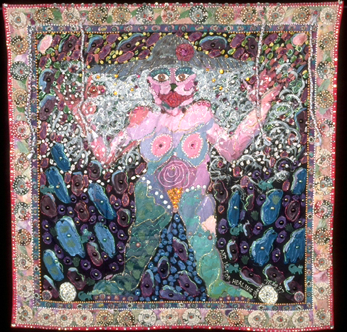 I do believe that this is true. We are all here to express our creativity in whatever form. And if we are creating art it is very healing because we are getting in touch with and revealing our innate nature. In 1997, I spent the year on my own inner healing of issues of incest. I went to therapy and did many drawings stemming from childhood memories, pleasant and unpleasant. This revealing quilt has a painted and embellished surface, with braided fabric along the top and “yo-yos” around the border.