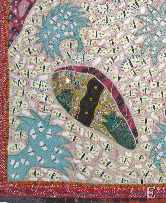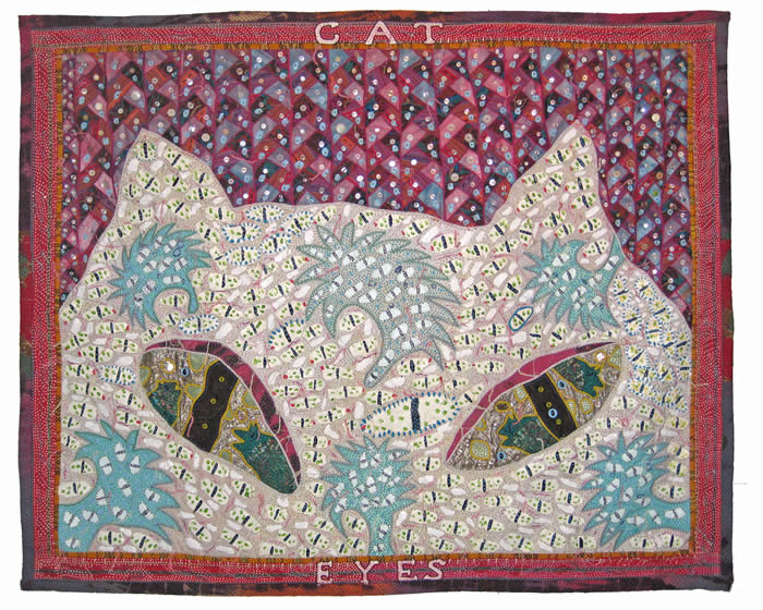 I love looking into my cat’s eyes and seeing the texture and colors of the irises. Cats have an animated way of looking at critters. In this quilt I am expressing the wonder of what a cat must be taking in with it’s eyes, so I put little critters into this cat’s eyes. I have embellished this quilt with many buttons and paint dots. Machine appliqué, fabric, thread, acrylic paint.