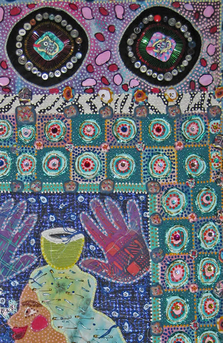 This piece was part of a series of 6 inner child quilts that I made in 1993. I have always strongly believed in the healing of the inner child, and I have done a lot of work in that area. Each of the six quilts has a different child character with it’s own distinct personality. Each one has the “flying saucers” across the top, made up of small painted panels and embellished with beads, buttons and embroidery. The quilts are covered with polymer clay buttons, acrylic paint, and fabric paint. This quilt’s character, “Sandy” is balancing a cup on her head, and a little dog on her nose. The hands above her affirm her creativity. Machine Appliqué, fabric, thread, beads, buttons, painted panels, polymer clay, acrylic paint, fabric paint.