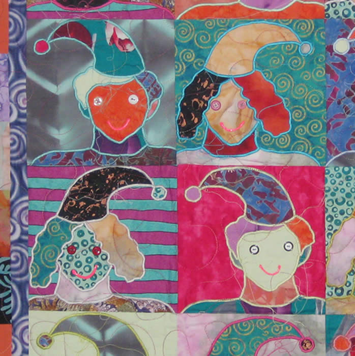 “Elf Quilt” is one of my series of “The Quilted Portrait” or “puzzle interchange machine appliqué” quilts. I designed the elves so that one pattern is a boy elf and the other one is a girl elf. The girl elf has a hat that points to the right and the boy elf is wearing a hat that points to the left. This piece would look great in a children’s room or on a hospital wall. The materials and techniques are machine appliquéd fabric, thread, buttons, and paint.