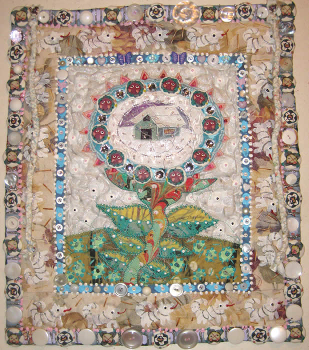 I was imaging that you could look into the centers of flowers and see a whole other world. It would be like being Alice and looking “Through the Looking Glass”. In this small quilt I chose the image of a little house in the snow. The piece has very feminine light colored fabrics, buttons, polymer clay buttons and braids. It sparkles like a little jewel.