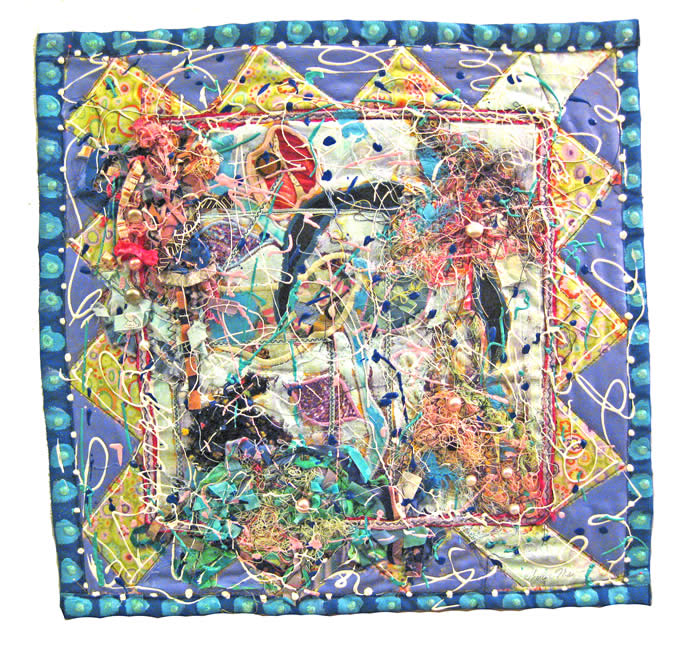 This art quilt is like an abstract expressionistic painting with painted fabric and bunches of thread sewn to the surface creating a sense of freedom and fun.
