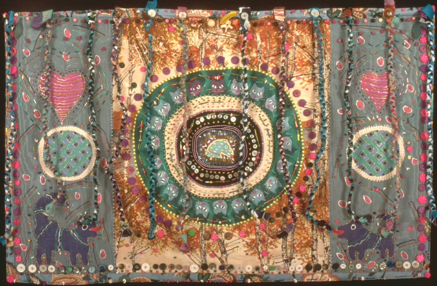 I made this piece for an exhibit which began at the Mobilia Gallery in Cambridge, MA and traveled throughout the US. I decided that I wanted to use as many techniques as I could think of. I embroidered, rubber stamped, painted, sewed buttons and made braids. I used all recycled fabrics and materials.