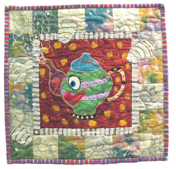 This quilt is part of a series of artworks depicting tea cups and tea pots with faces painted on them. Fabric, thread, acrylic paint, machine pieced, machine applique, machine quilted.