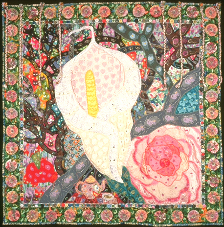 I made this quilt as part of an exhibit that took place on an island near the coast of Germany. Curated by Diana Leone, the theme of the show was flowers. Diana had been designing a lot of fabric at the time, so I used some of her fabric in my quilt. I chose the Cala Lilly as my central image out of inspiration and respect for Georgia O’Keefe and her large flower paintings. I have also used images of tree branches to suggest a forest, and toward the bottom of the quilt is a teapot and cups, suggesting a hidden picnic. I embellished the quilt with paint, buttons, beads, braids and “yo-yos”. Also Machine appliqué, fabric, thread, rubber stamps.