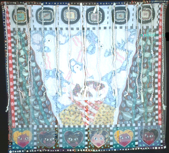 In this artwork, I have shown big white birds bursting out of a cone-shaped container. In the top section I have placed my flying saucers with little painted panels, beads, buttons and embroidery. On the bottom row, I have placed the six brides and the entire quilt is covered with strips of veil that can be lifted to reveal their faces and the details of the surface. I often thought if I ever remarried, I might remove the veils! The materials and techniques are machine appliqué, fabric, thread, buttons, beads, painted panels, acrylic paint, fabric paint, braids, and veils.